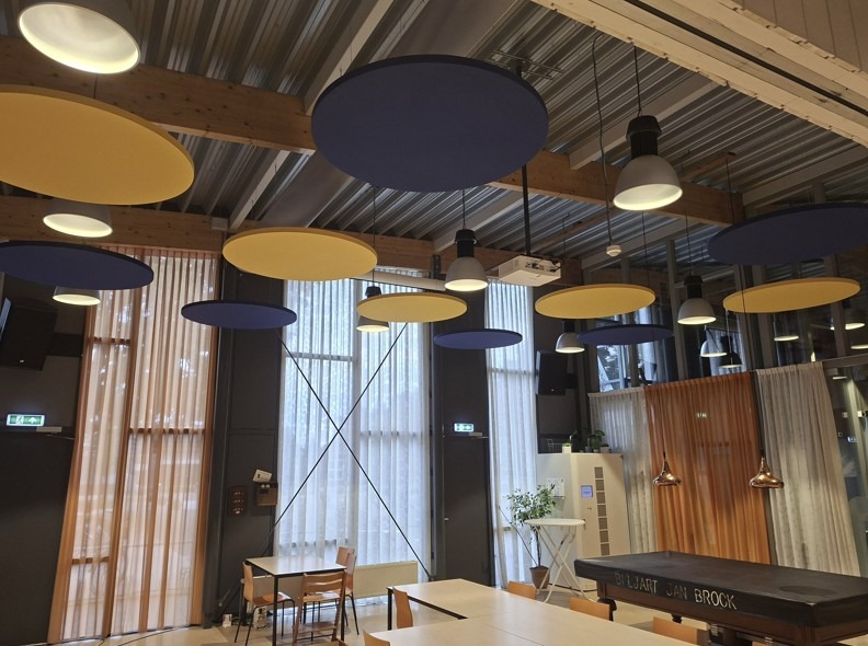 Door het aanbrengen van speelse cirkelvormigs elementen is het plafond van het dorpshuis verlaagd. Het zorgt voor een warme uitstraling en ook de akoestiek is verbeterd.
